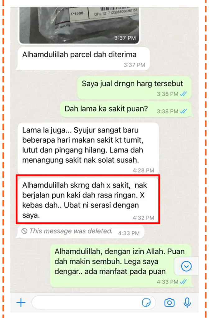 *PENAFIAN: Keberkesanan produk ini bergantung kepada kesesuaian individu. Setiap hasil dari penggunaan adalah berbeza bagi setiap individu. Produk ini akan memberi kesan terbaik sekiranya pengguna mengamalkan dengan cara betul berdasarkan banyak testimoni yang diperolehi. Kita berikhtiar, tuhan yang menyembuhkan.